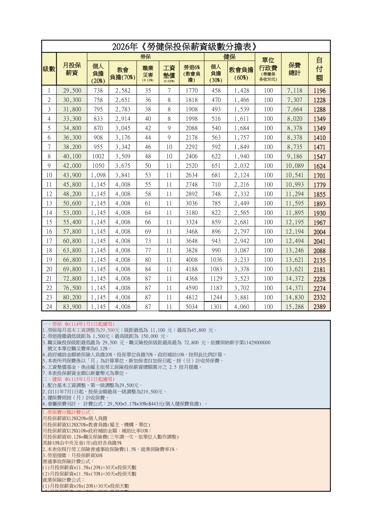 | 2026年勞健保投保薪資級數分擔表 |